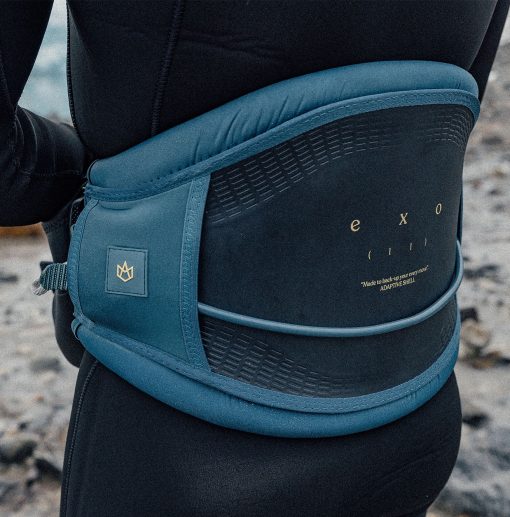 A parte macia do EXO é construída em uma “espuma única”. A espuma única não absorve água, por isso o arnês permanece leve e confortável após o uso.